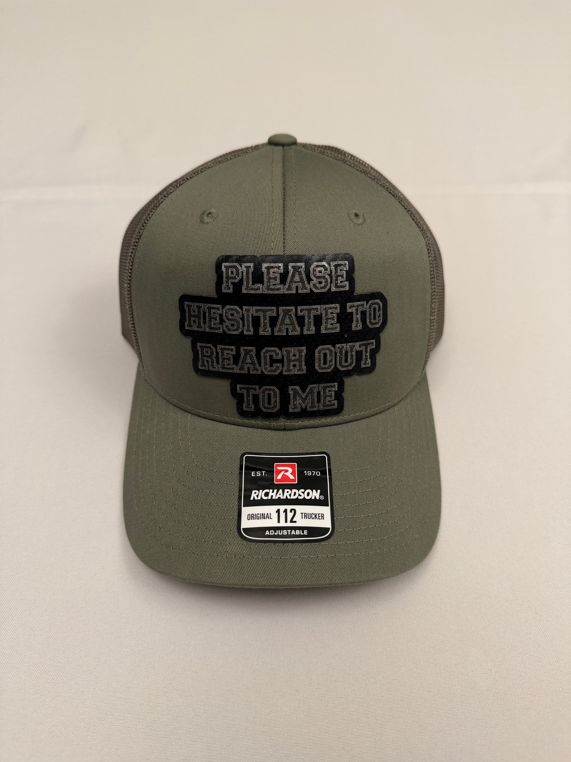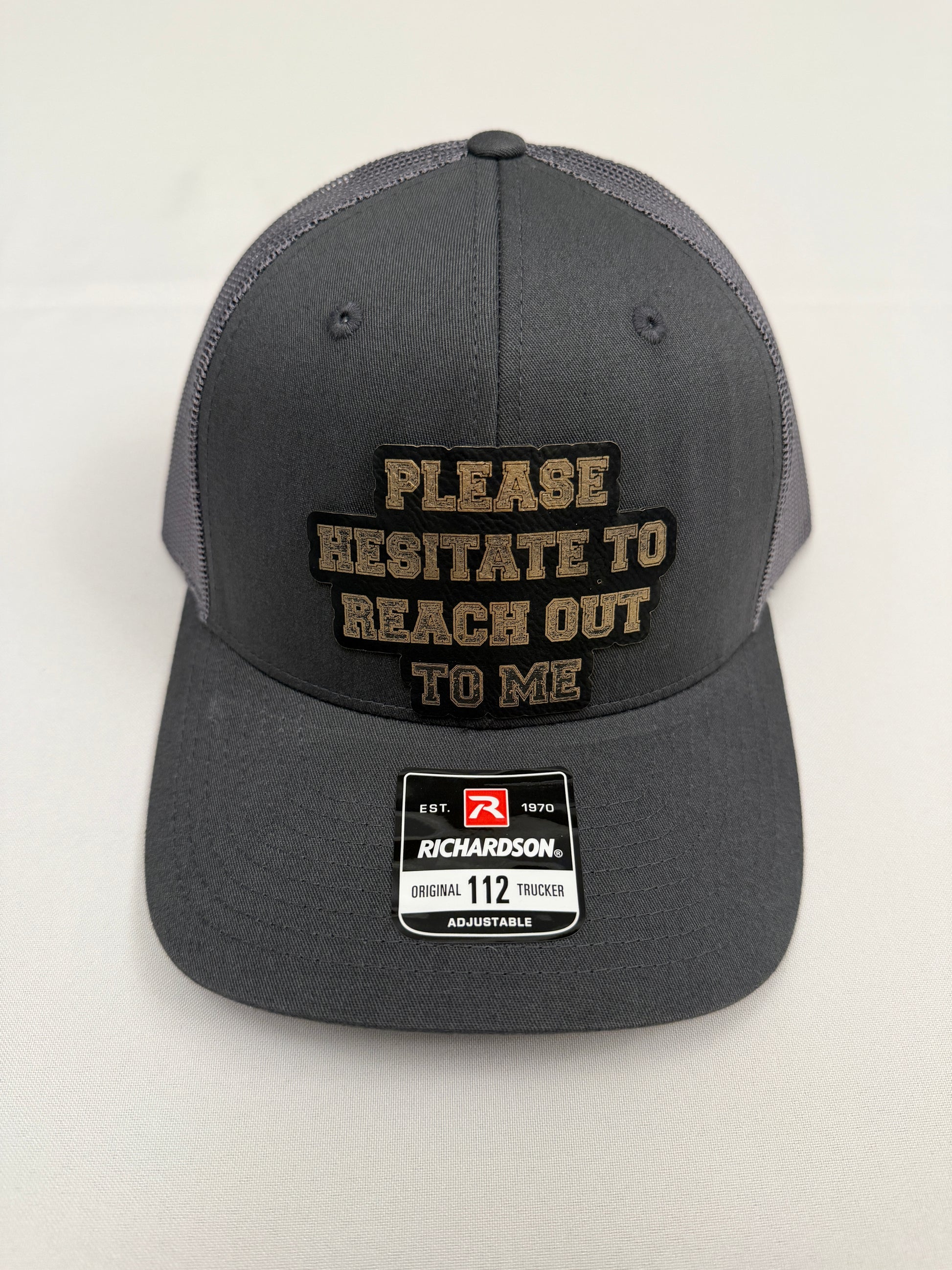 Our Please Hesitate To Reach Out To Me Trucker Hat Make a bold statement with this Richardson 112 trucker hat, featuring a custom embroidered patch that sets you apart. Built with a structured six-panel crown and classic mesh back, this hat delivers comfort and style for all-day wear. The curved bill and adjustable snapback closure ensure a perfect fit whether you're on the road or around town. Durable construction means this hat handles whatever your day throws at it. Stand out from the crowd with personalized flair that reflects your personality.